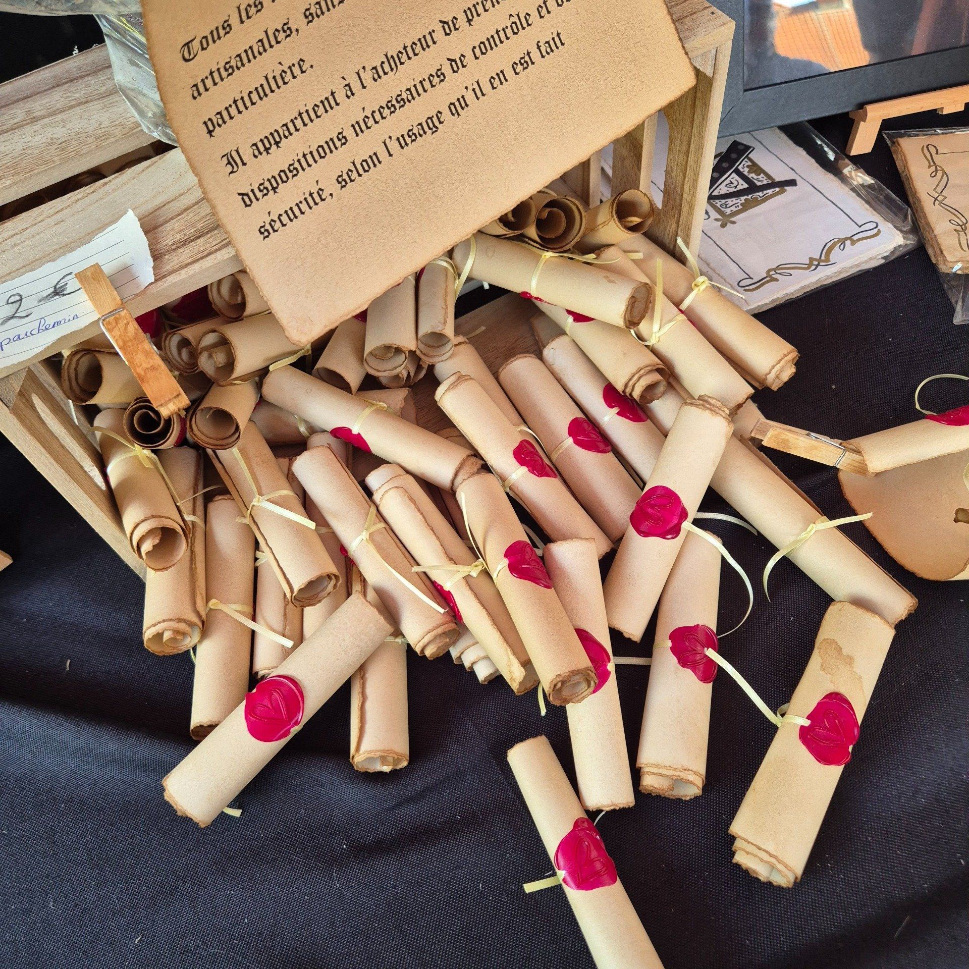 - Le secret : Vous pouvez rouler votre parchemin et le refermer d'un simple nœud. Contrairement aux cachets classiques, celui-ci ne se brise pas à l'ouverture : votre destinataire pourra le conserver intact et vous pourrez même le réutiliser.