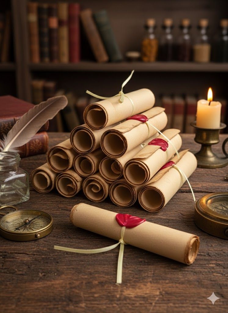 Photo principale : Il s'agit d'une mise en scène artistique générée par Intelligence Artificielle pour illustrer l'ambiance médiévale et l'univers du parchemin.
